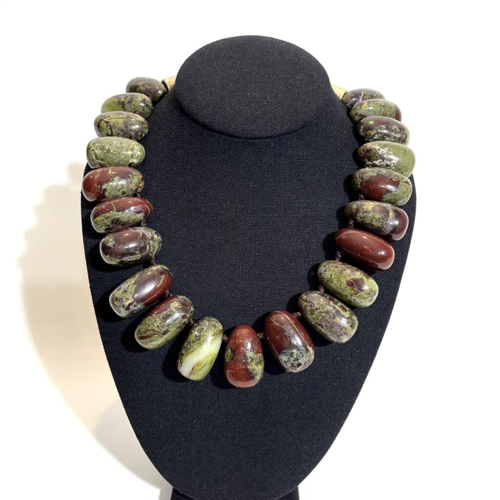 Discover the elegance of our stunning necklace featuring a beautiful combination of black and gray African Bloodstone. This unique piece enhances your style and promotes a balanced energy flow, making it perfect for those who experience static from fabrics or metals. With its naturally opaque quartz composition, this necklace is not just a fashion statement; it also helps combat Geopathic stress, providing beauty and wellness in one accessory.